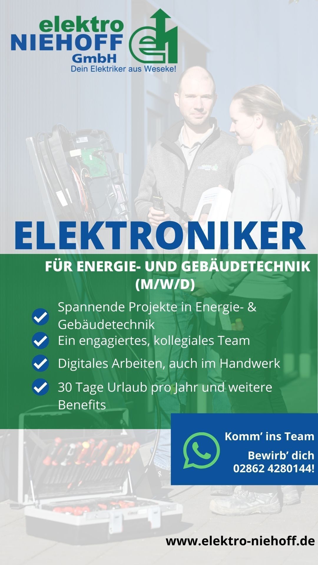 Bei der Elektro Niehoff GmbH sind wir stets auf der Suche nach neuen, engagierten Mitarbeitern. Wir freuen uns über Deine Bewerbung.